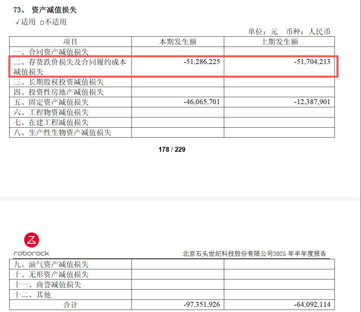 而石头科技今年上半年资产减值损失为9735.19万元。其中因库存积压造成的损失仅仅为5128.62万元(远不及同业公司一半),同比亏损甚至略有缩窄。